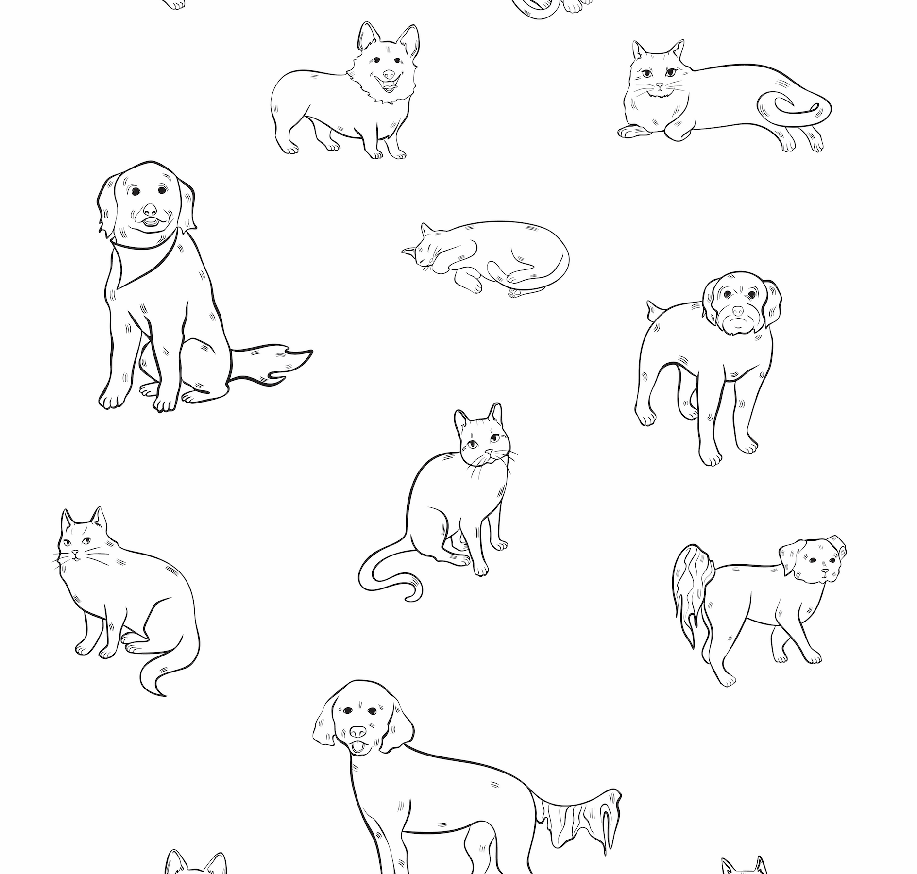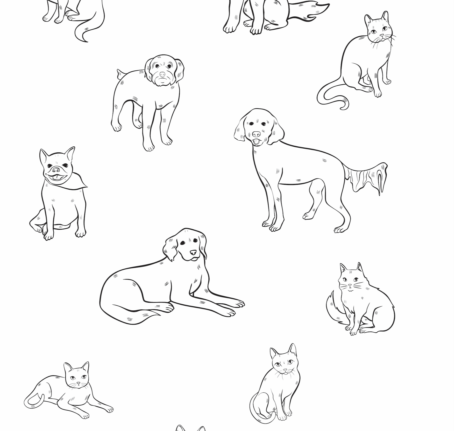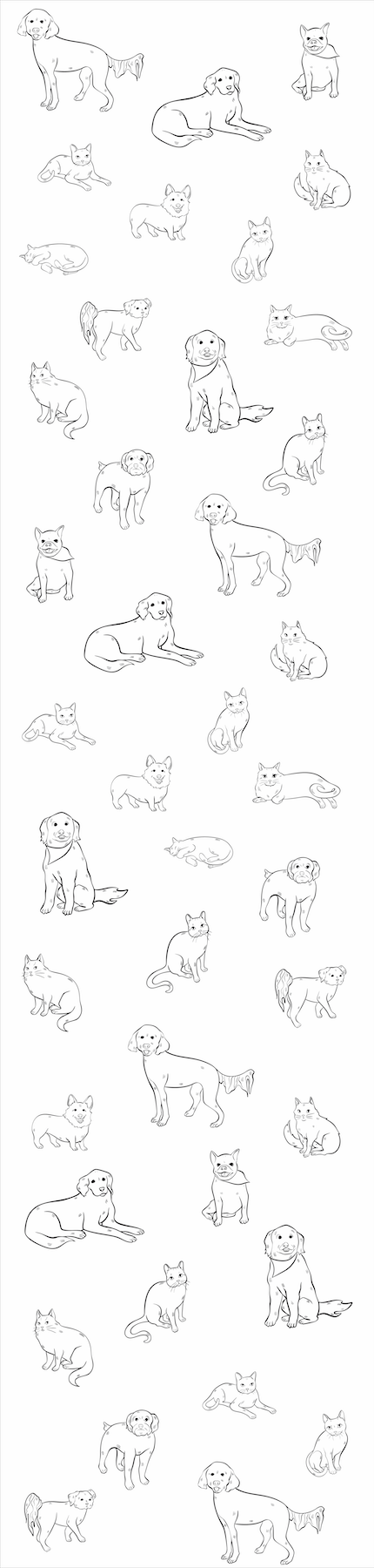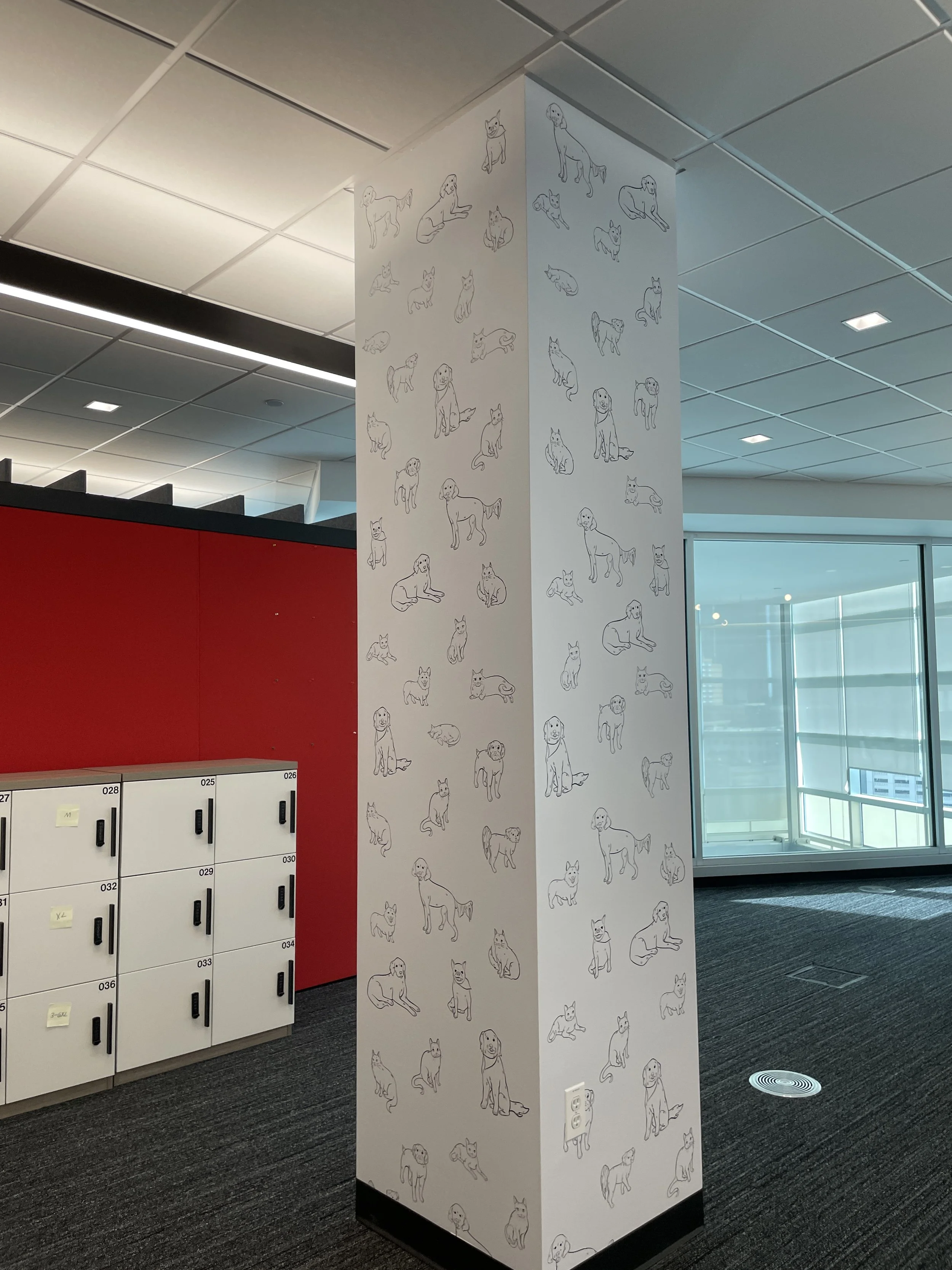 Wallpaper created on request for pillar in communal business area. All animals are inspired by fellow team member’s pets. Hand drawn on paper, scanned into and inked in procreate, layout and design files finalized in Adobe Illustrators. October 2024.