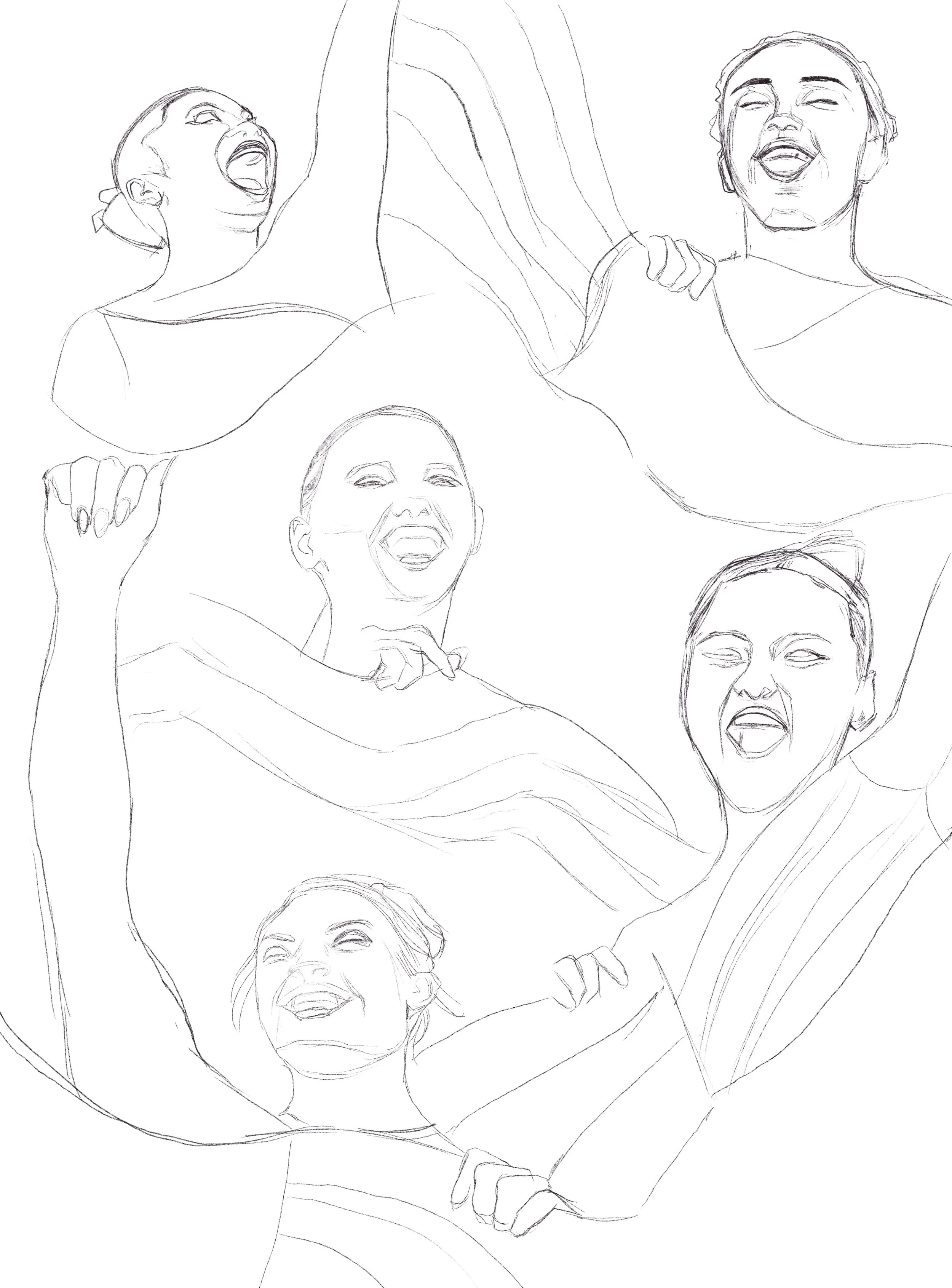 Collage created from a singular image as reference. Sketched digitally using a grid. Rendered using a colored pencil brush.
